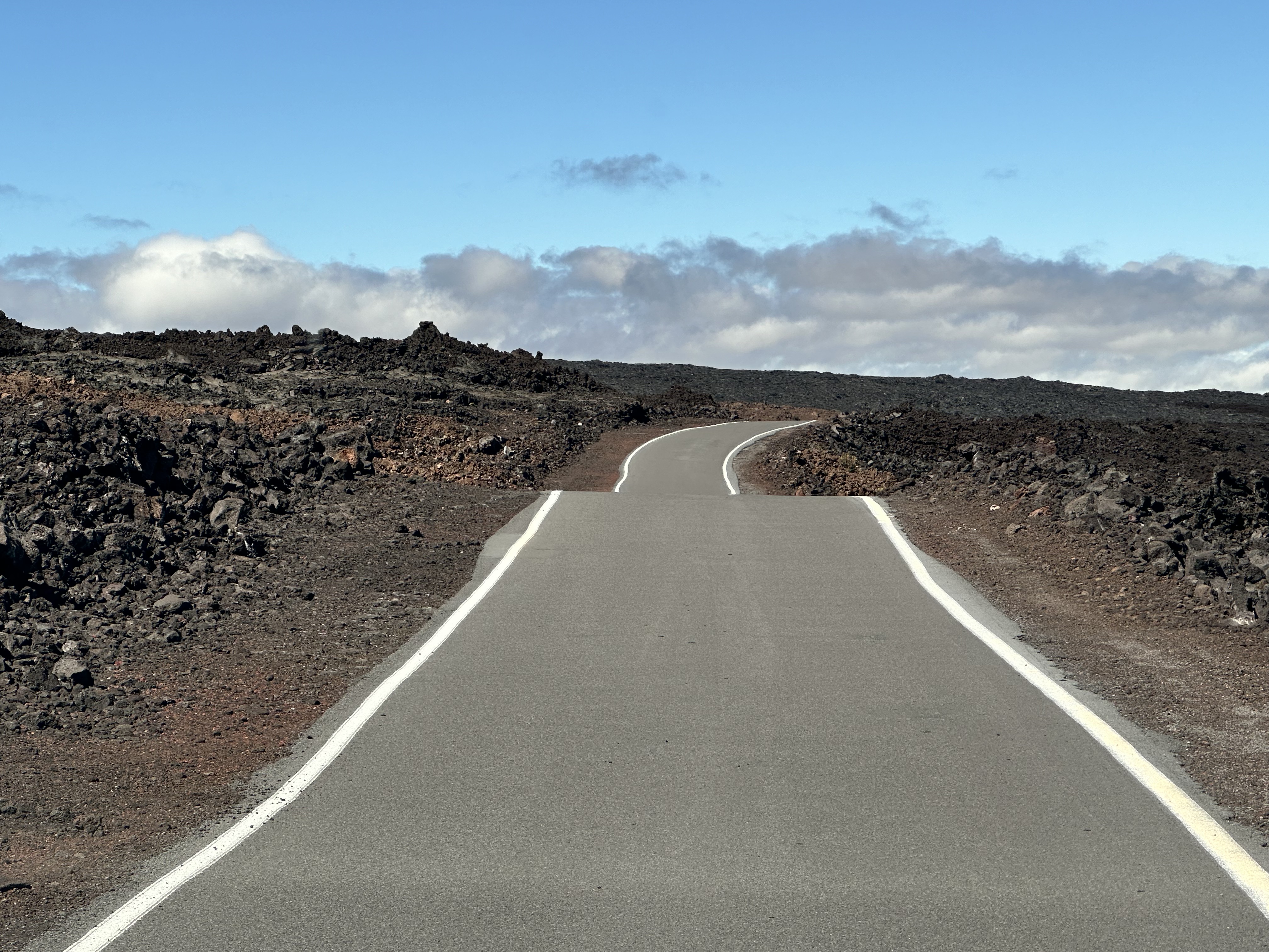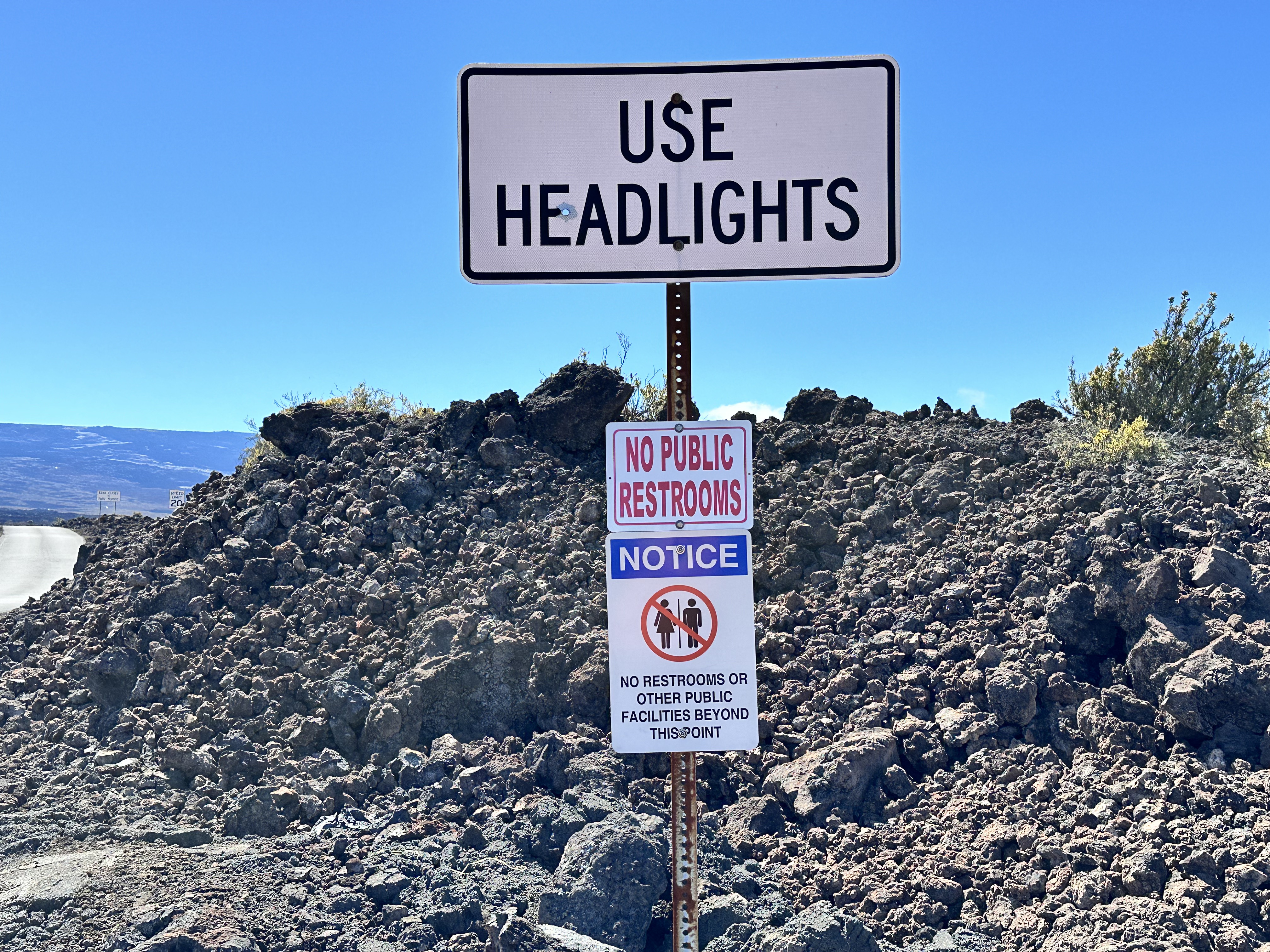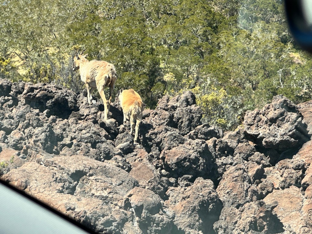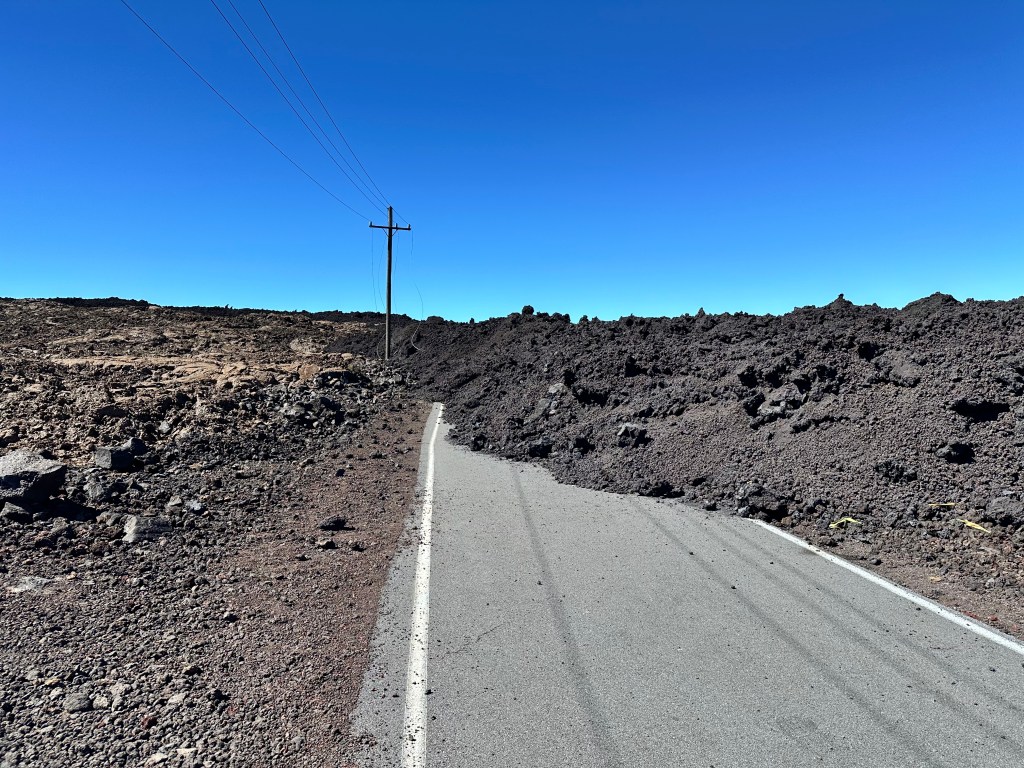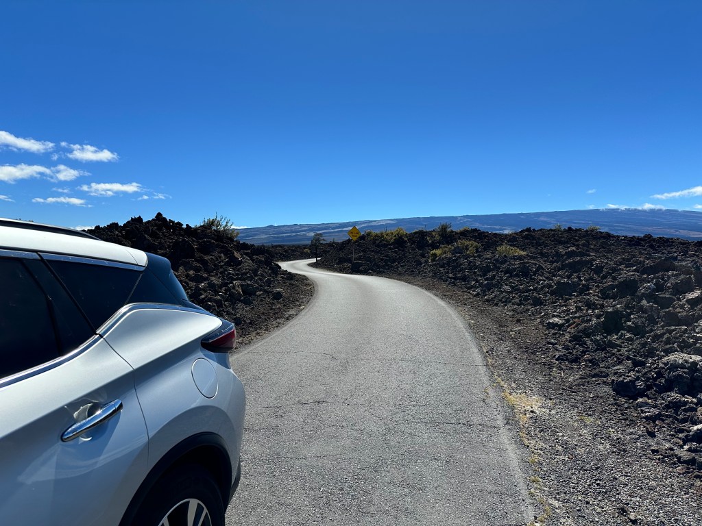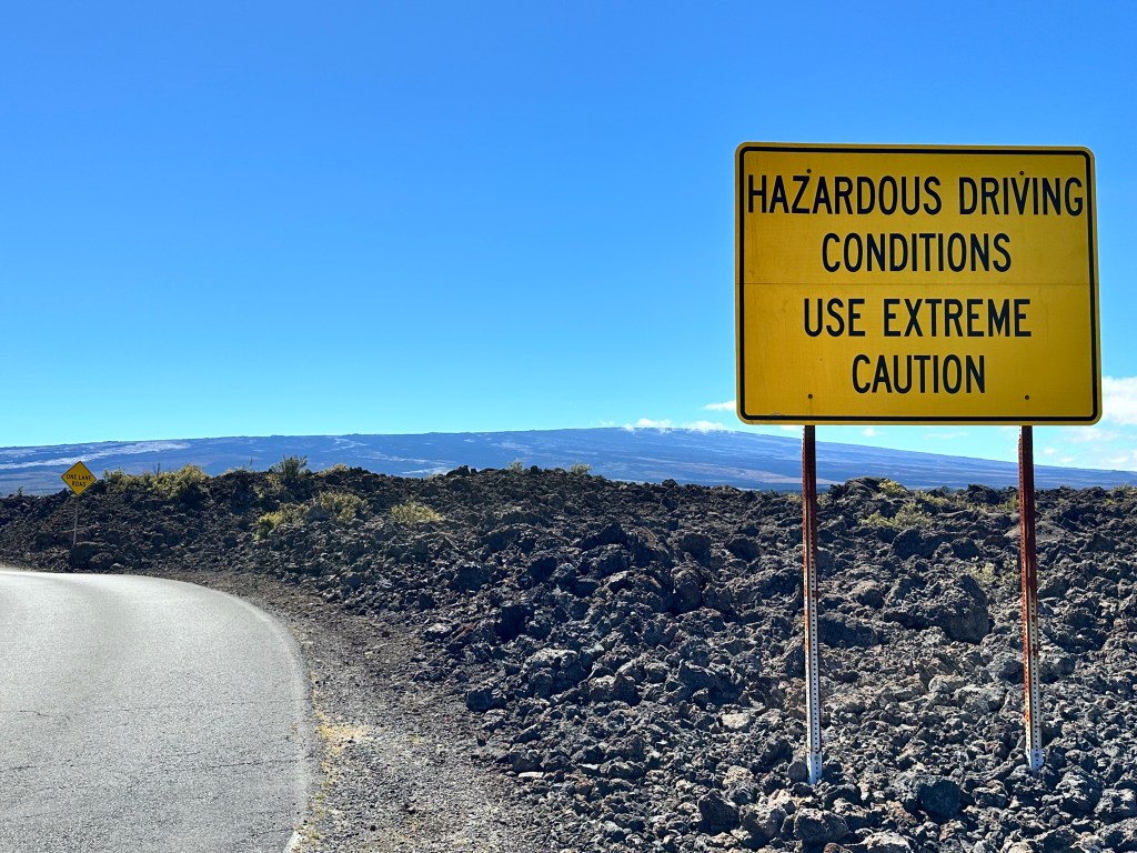 We then drove across the highway up the north side of Mauna Loa. We had an “exciting” drive up to where the 2022 lava flow crossed the road see rocks that were younger than us! “exciting” meaning the road was one-lane, curvy, and had volcanic rock piles taller than the car on both sides most of the about 11 miles each way! Coming back down was less dramatic since we knew the what to expect. The signs should have given us a clue.