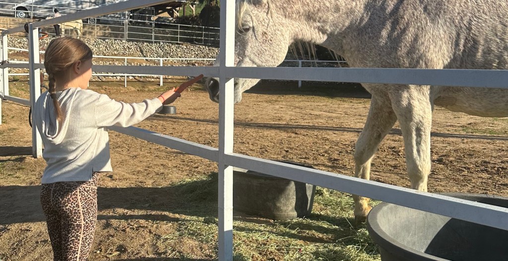 The girls also visited with a friend who has horses. They both LOVE riding and feeding them carrots. And of course, they love their treats when we pick them up at the airport.